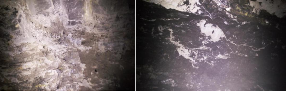 施工過(guò)程中,高水速凝砂漿材料漿液在泵壓的作用下滲透到破碎巖體的裂隙中,開(kāi)幫結(jié)果顯示漿液固結(jié)體呈薄厚不一的片狀或條狀,漿液擴(kuò)散半徑較大,相鄰注漿孔漿液擴(kuò)散范圍有重合部分,破碎煤巖體整體性大大改善,從而大大提高圍巖承載能力及穩(wěn)定性,現(xiàn)場(chǎng)效果已得到內(nèi)蒙古某公司下屬煤礦及甘肅某公司下屬煤礦相關(guān)領(lǐng)導(dǎo)的高度認(rèn)可,我公司與礦方已達(dá)成長(zhǎng)遠(yuǎn)合作意向。